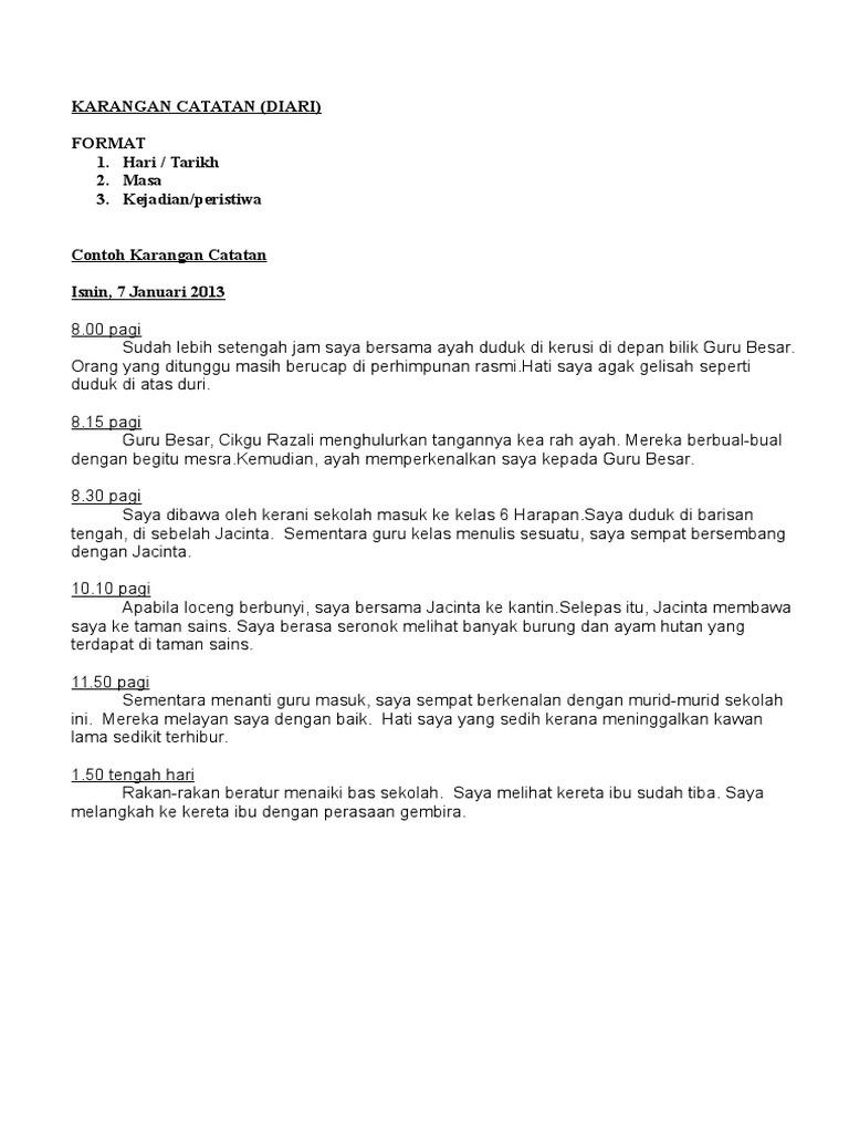 . Pada cuti sekolah yang lalu kamu berpeluang bercuti bersama-sama keluarga kamu di tempat yang menarik. 1218 AM Karangan jenis catatan diari Kertas 2 Panduan membuat karangan. Jika sehari sertakan haribulan hari dan waktu berlakunya sesuatu aktiviti.
